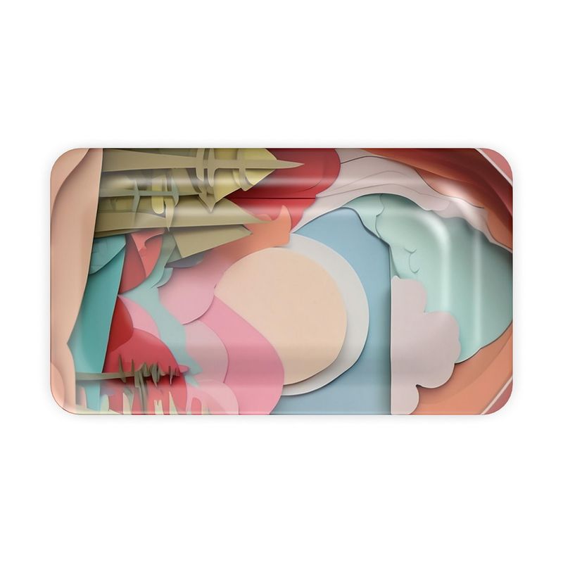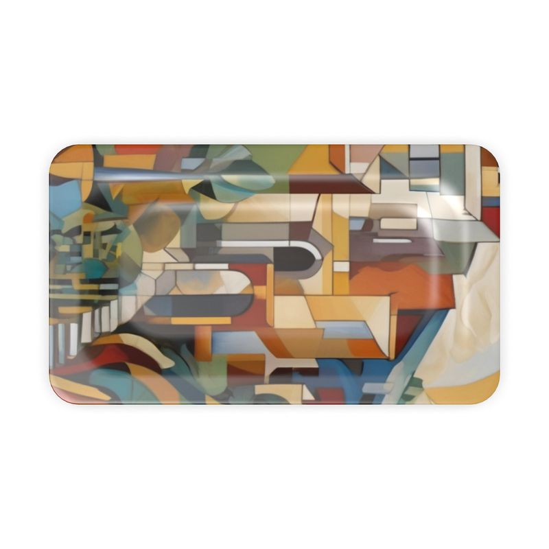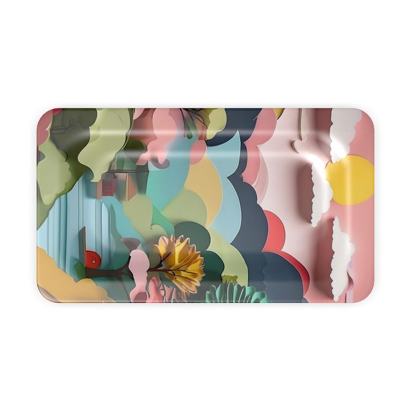 Close-up of Paris Flea Market tray glossy surface showing vintage-inspired pattern and scratchproof finish, hand-printed decorative serving piece